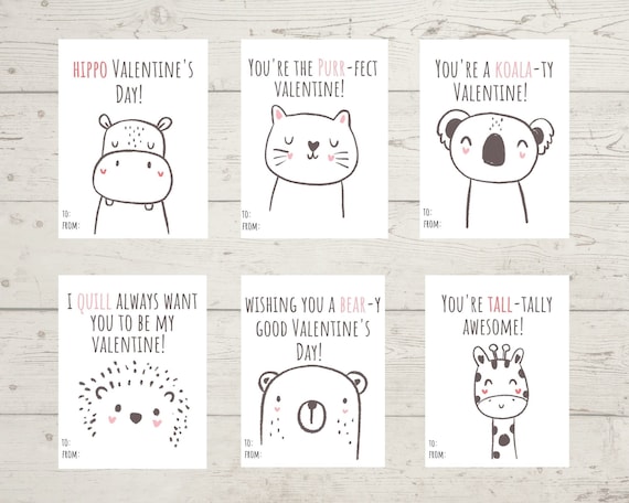 Printable Kids Valentines Cards Hippo Cat Koala Giraffe Bear Etsy